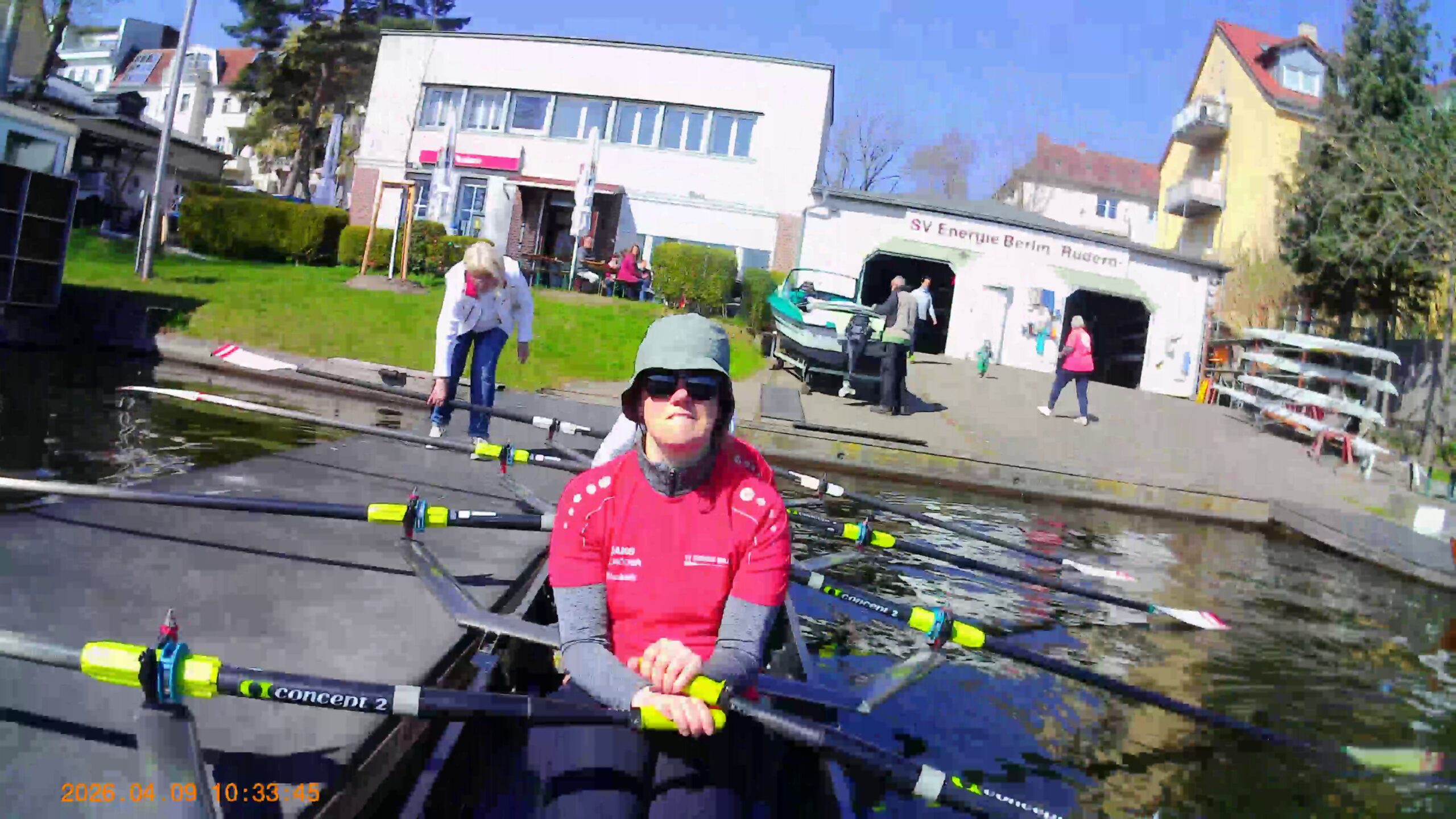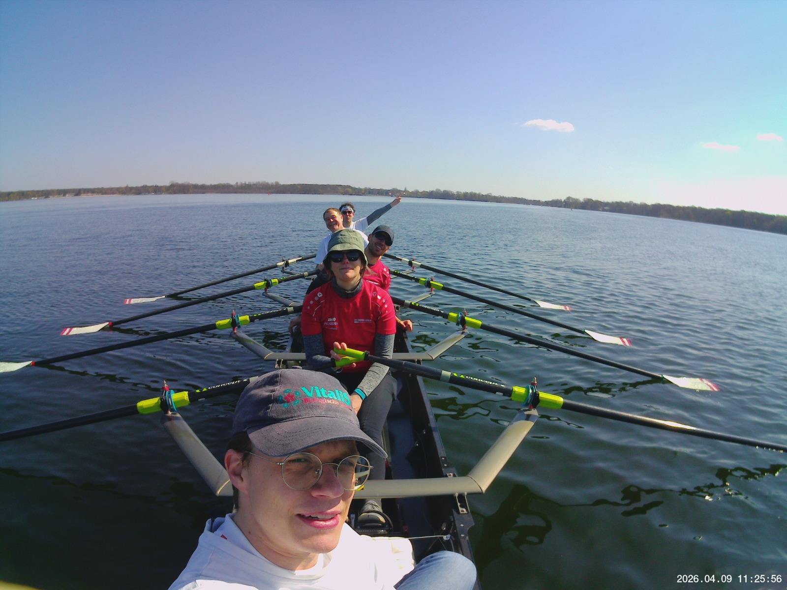 Robert, Clemens, Elisabeth, Philipp und ich hatten uns vorgenommen, unsere erste lange Fahrt ohne Betreuer zu absolvieren. Die Fahrt rund um den Müggelsee war anstrengend, aber auch sehr spannend. 30 km sind nicht zu unterschätzen. Alles, was Dieter und Wolfgang uns beigebracht haben, hat gezählt: ruhig vorrollen, nicht beschleunigen und nicht nach vorne stürzen. Man hat wirklich viel mehr Spaß beim Rudern, wenn sich das Boot fließend und rund bewegt. Die Blasen an den Fingern sind zwar immer noch da, aber es hilft enorm, wenn die Kraft konstant durchgezogen wird, statt nur ruckartig mit den Beinen zu drücken.