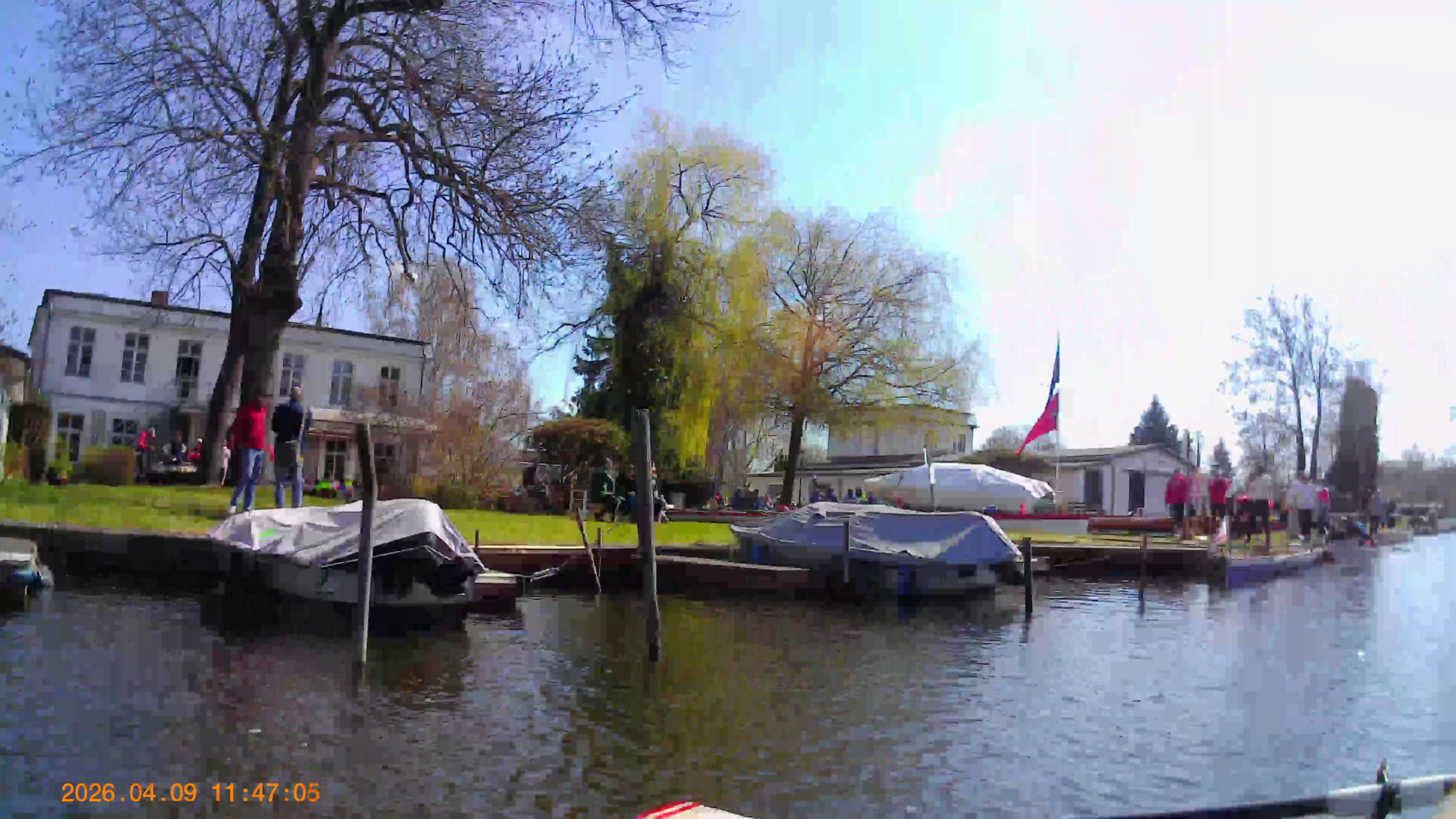 Aufgeladen mit neuer Energie sind wir von Rahnsdorf Richtung Dämeritzsee und danach zum Seddinsee gefahren – diesmal mit Elisabeth am Steuer und Philipp als Schlagmann. Während Manche die Kanäle langweilig finden, genießen Andere den Schutz gegen den Wind und die Frühlingsfarben des Waldes. Wir folgten dem Kanal, bis Dieters Boot am Rand stoppte, weil ein Mannschaftsmitglied dringend mal „austreten“ musste. Weiter ging es zum Seddinsee, wo wir eine verdiente Trink- und Essenspause machten. Nicht nur Wasser, sondern auch Süßigkeiten gehören ins Boot, um die Energiespeicher aufzuladen. Die Frage, ob wir links oder rechts am Seddinwall vorbeifahren sollten, klärte sich schnell, als wir andere Ruderboote sahen. Die Farben des Frühlings waren überall zu sehen und das Vogelgezwitscher überall zu hören. Die herrliche Landschaft begleitete uns bis nach Schmöckwitz. Da der dortige Verein jedoch voll war und es nichts zu essen gab, sind wir direkt nach Grünau zur Anrudern-Party weitergefahren.