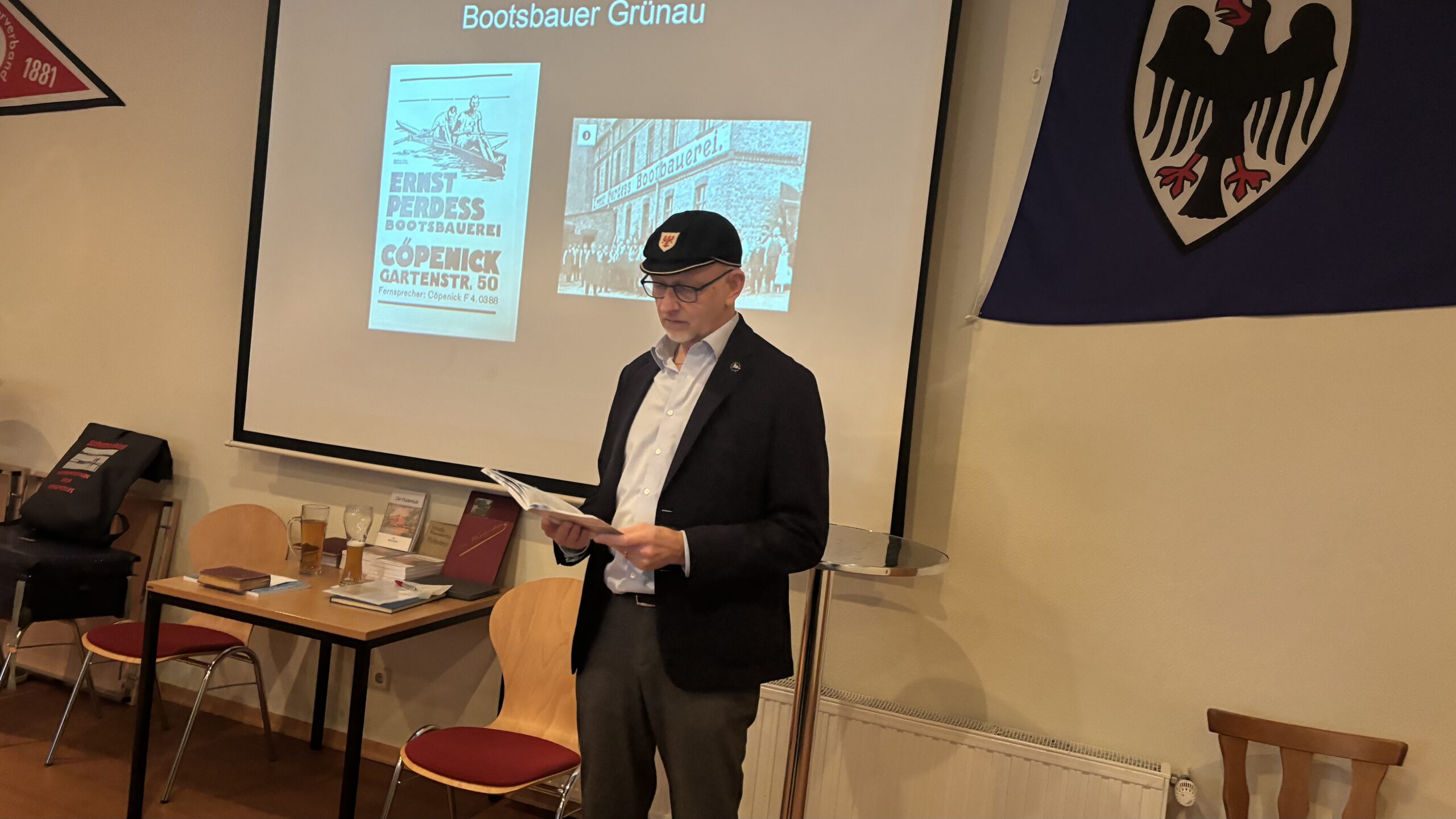 Unterhaltsam wurde er dabei von Matthias (Zappel) Zander begleitet, der mit passenden historischen Bildern und Episoden die Buchgeschichte illustrierte. Zappel ist ehemaliger erfolgreicher Leistungsruderer bei der SG Dynamo Potsdam und beim Berliner RC. Darüberhinaus ist er zusammen mit Carsten Brzeski Hoster des Ruderpodcasts Schubschlag, indem er über Leidenschaft, Freundschaft, Lebensphilosophie mit und ohne Gästen über Geschichten, die der Rudersport und seine Menschen in den letzten Jahrzehnten geschrieben haben, redet.